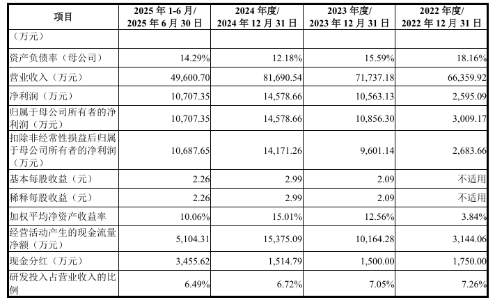 财务方面,于2022年度、2023年度及2024年度及2025年1-6月,公司实现营业收入分别约为人民币6.64亿元、7.17亿元、8.17亿元、4.96亿元。同期,公司净利润分别约为人民币2595.09万元、1.06亿元、1.46亿元、1.07亿元。