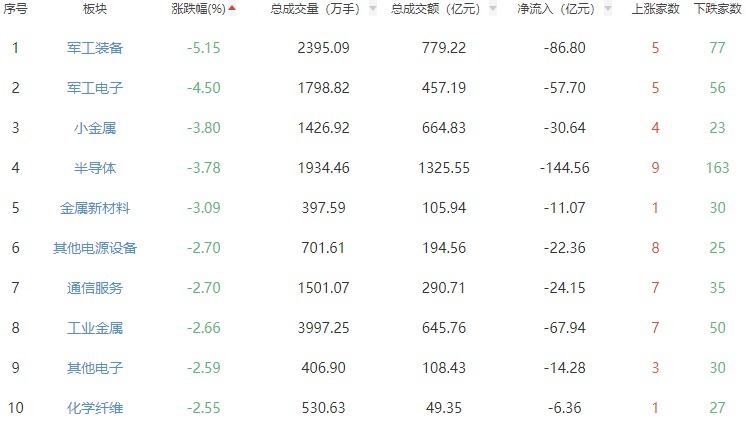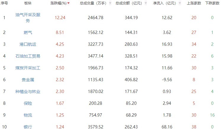 板块方面,油气开采及服务、燃气、港口航运等涨幅居前,军工装备、军工电子、小金属等跌幅居前。